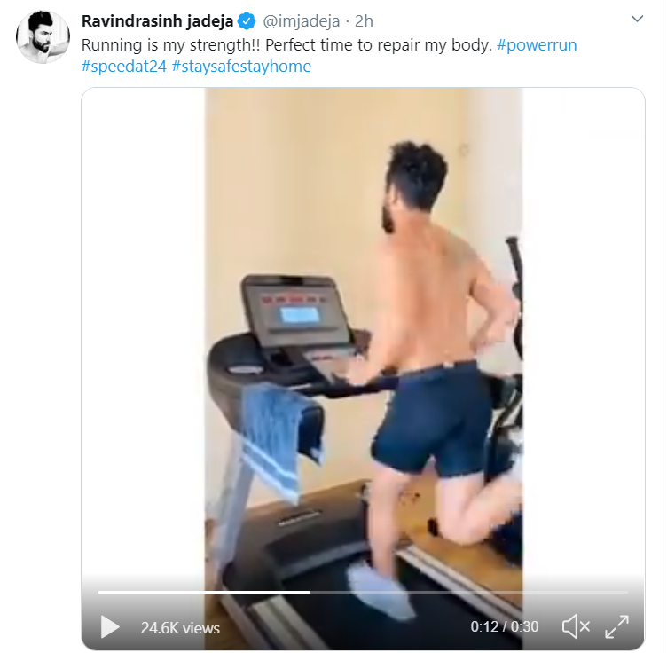 Taking to Twitter, the all-rounder shared a video and captioned the post: "Running is my strength!! Perfect time to repair my body. #powerrun #speedat24 #staysafestayhome."