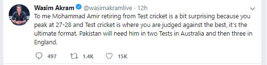 "To me, Mohammad Amir retiring from Test cricket is a bit surprising because you peak at 27-28 and Test cricket is where you are judged against the best, it's the ultimate format. Pakistan will need him in two Tests in Australia and then three in England," Akram tweeted.
