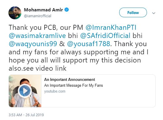 "Thank you, PCB, our PM @ImranKhanPTI @wasimakramlive Bhi @SAfridiOfficial Bhi @waqyounis99 & @yousaf1788. Thank you and my fans for always supporting me and I hope you all will support my this decision also see video link," Amir had tweeted.