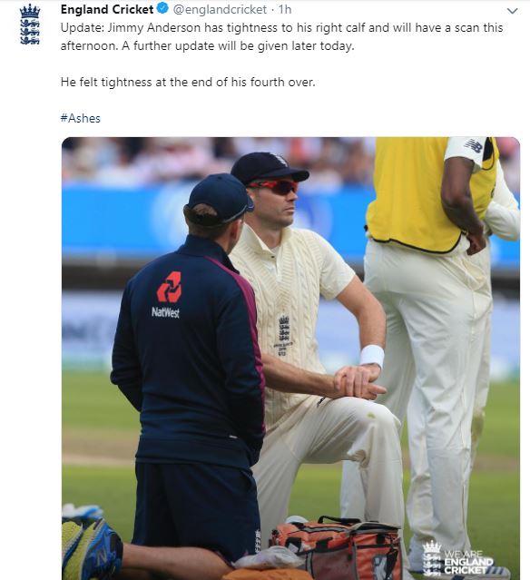 "Jimmy Anderson has tightness to his right calf and will have a scan this afternoon. A further update will be given later today. He felt tightness at the end of his fourth over," England Cricket tweeted.