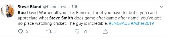 "Boo David Warner all you like, Bancroft too if you have to, but if you can't appreciate what Steve Smith does game after game after game, you've got no place watching cricket. The guy is incredible. #ENGvAUS #Ashes2019," one fan tweeted.