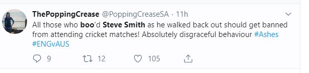 "All those who booed Steve Smith as he walked back out should get banned from attending cricket matches! Absolutely disgraceful behaviour #Ashes #ENGvAUS," another fan tweeted.