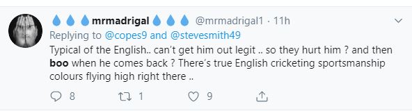 "Typical of the English.. can't get him out legit .. so they hurt him ? and then boo when he comes back? There are true English cricketing sportsmanship colours flying high right there," one Twitter user commented.