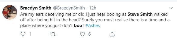"Are my ears deceiving me or did I just hear booing as Steve Smith walked off after being hit in the head? Surely you must realise there are a time and a place where you just don't boo? #Ashes," another user commented.