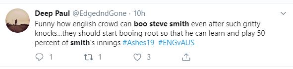 "Funny how English crowd can boo steve smith even after such gritty knocks...they should start booing root so that he can learn and play 50 per cent of smith's innings #Ashes19 #ENGvAUS," another fan tweeted.