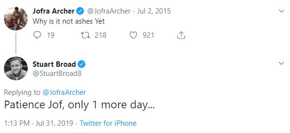 "Patience Jof, only 1 more day..," Broad replied to Archer's 2015 tweet, "Why is it not ashes Yet."