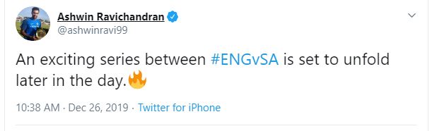 "An exciting series between #ENGvSA is set to unfold later in the day," Ashwin tweeted.