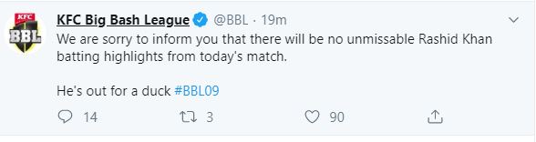 After this, BBL's handle came up with a tweet, which read--" We are sorry to inform you that there will be no unmissable Rashid Khan batting highlights from today's match. He's out for a duck #BBL09".