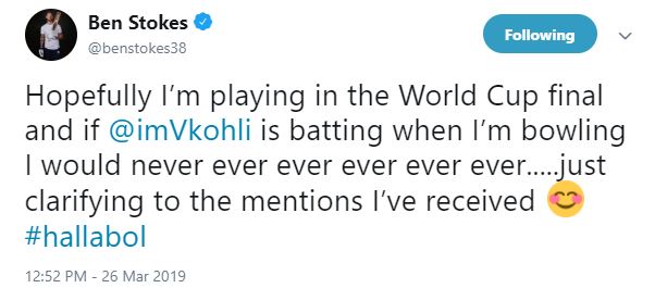 "Hopefully I am playing in the World Cup final and if @imVkohli is batting when I am bowling I would never ever ever ever ever ever.....just clarifying to the mentions I have received #hallabol," Stokes wrote on his Twitter account.