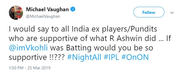 Earlier, Michael Vaughan, the former England captain had tweeted asking the Indian contingent who were seen supporting Ashwin for his "Mankad" act whether they will have the same reaction if the Indian skipper Kohli got dismissed in the same manner.
