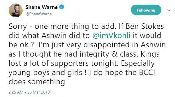 "Sorry - one more thing to add. If Ben Stokes did what Ashwin did to @imVkohli it would be ok? I’m just very disappointed in Ashwin as I thought he had integrity & class. Kings lost a lot of supporters tonight. Especially young boys and girls! I do hope the BCCI does something," Warne tweeted.