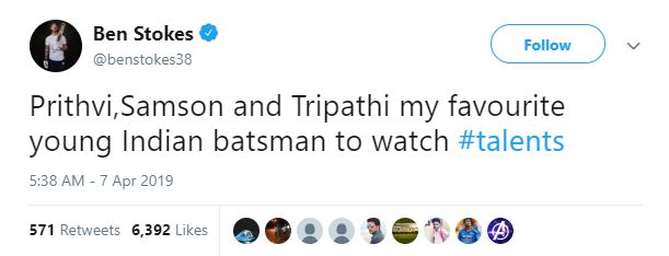 "Prithvi, Samson and Tripathi my favourite young Indian batsman to watch #talents," Stokes posted on his Twitter account.
