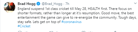 "England suspend 1st class cricket till May 28, HEALTH first. There focus on shorter formats, rather than longer at it's resumption. Good move, the best entertainment the game can give to re-energize the community. Tough days, stay safe. Let's get on top of #coronavirus," Hogg tweeted.