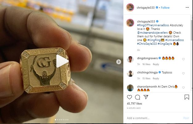 Gayle, commonly known as the 'Universe Boss' shared the pictures of the ring on Instagram and captioned the post as: "#RingOfTheUniverseBoss Absolutely love it. Thanks, @mcleanandcojewellers. Check them out for further details! Own one".