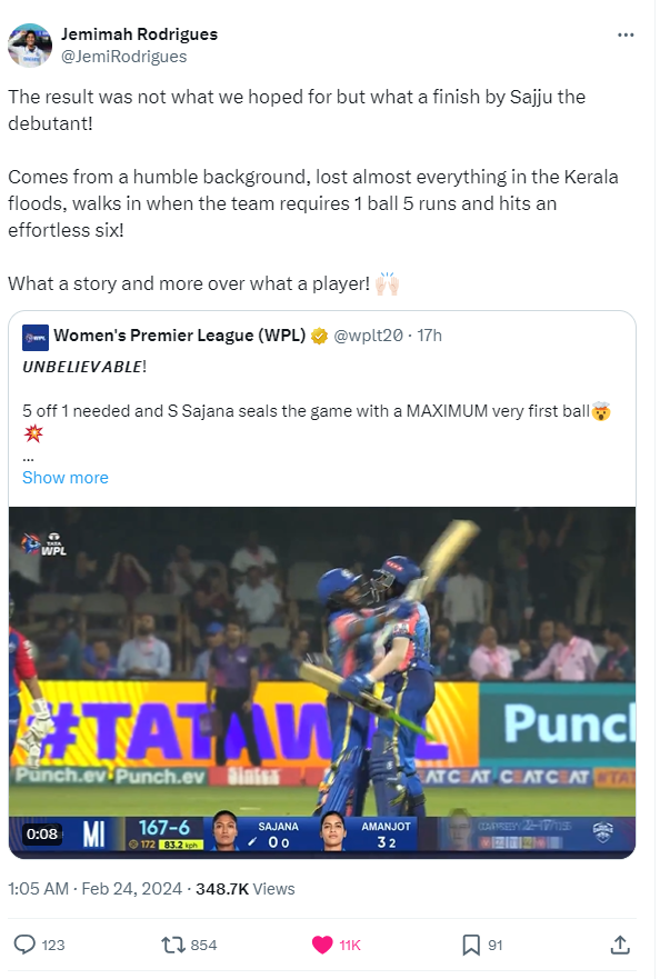 Following the match, Jemimah lauded the MI player for her finishing on X (formerly Twitter), pointing out that Sajana comes from a very humble background and lost almost everything during floods in Kerala.