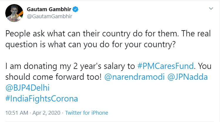 "People ask what can their country do for them. The real question is what can you do for your country? I am donating my 2 year's salary to #PMCaresFund. You should come forward too! @narendramodi @JPNadda @BJP4Delhi #IndiaFightsCorona," Gambhir tweeted.
