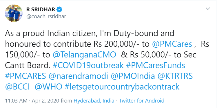 "As a proud Indian citizen, I'm Duty-bound and honoured to contribute Rs 200,000/- to @PMCares, Rs 150,000/- to @TelanganaCMO & Rs 50,000/- to Sec Cantt Board. #COVID19outbreak #PMCaresFunds #PMCARES @narendramodi @PMOIndia @KTRTRS @BCCI @WHO #letsgetourcountrybackontrack," Sridhar tweeted.