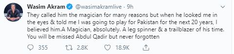 "They called him the magician for many reasons but when he looked me in the eyes & told me I was going to play for Pakistan for the next 20 years, I believed him. A Magician, absolutely. A leg spinner & a trailblazer of his time. You will be missed Abdul Qadir but never forgotten," former Pakistan bowler Wasim Akram tweeted.