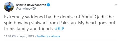 "Extremely saddened by the demise of Abdul Qadir the spin bowling stalwart from Pakistan. My heart goes out to his family and friends. #RIP," India spinner Ravichandran Ashwin tweeted.