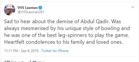 "Sad to hear about the demise of Abdul Qadir. Was always mesmerised by his unique style of bowling and he was one of the best leg-spinners to play the game. Heartfelt condolences to his family and loved ones," former India batsman VVS Laxman tweeted.