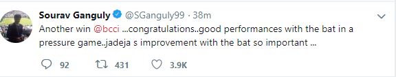 "Another win @bcci ...congratulations..good performances with the bat in a pressure game..Jadeja s improvement with the bat so important.," Ganguly tweeted.
