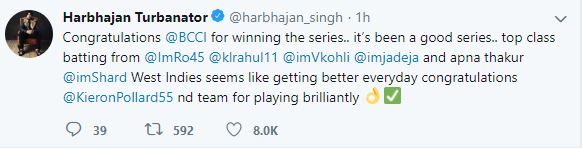 "Congratulations @BCCI for winning the series.. it's been a good series.. top class batting from @ImRo45 @klrahul11 @imVkohli @imjadeja and apna thakur @imShard West Indies seems like getting better everyday congratulations @KieronPollard55 nd team for playing brilliantly" Harbhajan tweeted.