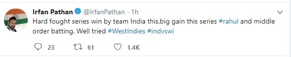 "Hard-fought series win by team India this.big gain this series #rahul and middle-order batting. Well tried #WestIndies #indvswi," he said.