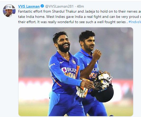 "Fantastic effort from Shardul Thakur and Jadeja to hold on to their nerves and take India home. West Indies gave India a real fight and can be very proud of their effort. It was really wonderful to see such a well-fought series," Laxman tweeted.