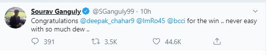 "Congratulations @deepak_chahar9 @ImRo45@bcci for the win .. never easy with so much dew," tweeted BCCI president Sourav Ganguly.