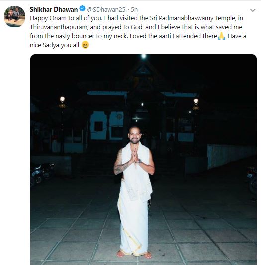 "Happy Onam to all of you. I had visited the Sri Padmanabhaswamy Temple, in Thiruvananthapuram, and prayed to God, and I believe that is what saved me from the nasty bouncer to my neck. Loved the aarti I attended there Have a nice Sadya you all," Dhawan tweeted.