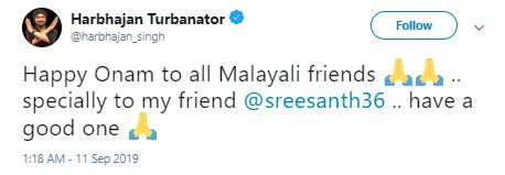 "Happy Onam to all Malayali friends .. specially to my friend @sreesanth36 .. have a good one," Singh tweeted.