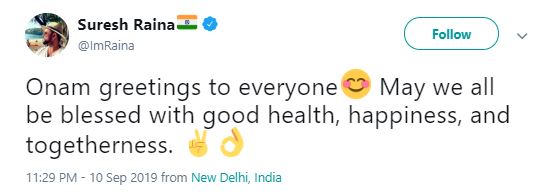 "Onam greetings to everyone May we all be blessed with good health, happiness, and togetherness," Raina tweeted.