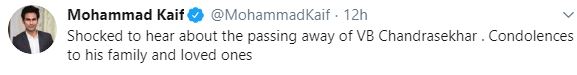 "Shocked to hear about the passing away of V B Chandrasekhar. Condolences to his family and loved ones." tweeted exceptional fielder Mohammad Kaif