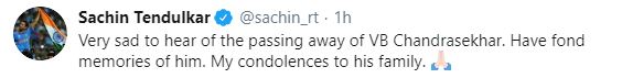 "Very sad to hear of the passing away of V B Chandrasekhar. Have fond memories of him. My condolences to his family." tweeted Tendulkar