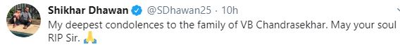 "My deepest condolences to the family of V B Chandrasekhar. May your soul RIP Sir." tweeted Shikhar Dhawan.