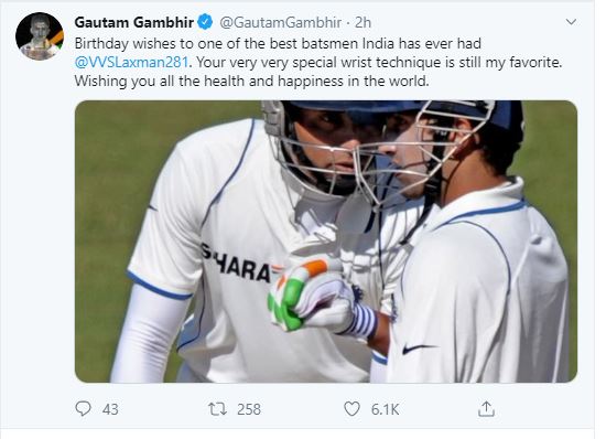 "Birthday wishes to one of the best batsmen India has ever had @VVSLaxman281.Your very very special wrist technique is still my favorite. Wishing you all the health and happiness in the world," tweeted Gambhir.