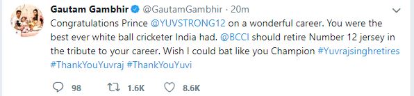 "Congratulations Prince @YUVSTRONG12 on a wonderful career. You were the best ever white ball cricketer India had. @BCCI should retire Number 12 jersey in the tribute to your career. Wish I could bat like you Champion #Yuvrajsinghretires #ThankYouYuvraj #ThankYouYuvi," former Indian cricketer Gautam Gambhir tweeted.