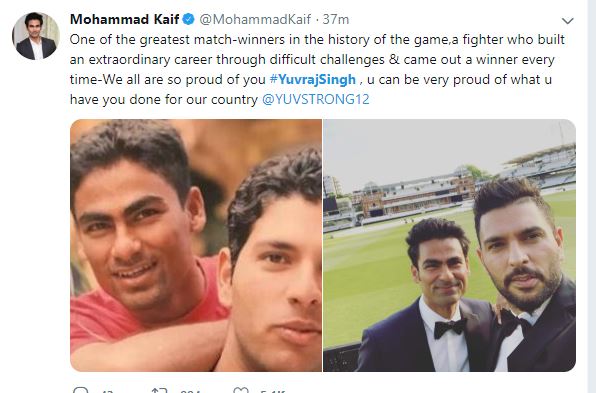 Mohammad Kaif, the Indian cricketer who has often been seen as Yuvi's partner-in-crime, their partnership in the 2002 Natwest series final against England is still remembered by cricket fanatics all over the world, also tweeted on Yuvi's retirement.