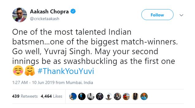 "One of the most talented Indian batsmen...one of the biggest match-winners. Go well, Yuvraj Singh. May your second innings be as swashbuckling as the first one #ThankYouYuvi," former Indian cricketer Aakash Chopra tweeted.