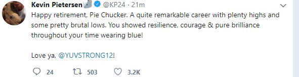 "Happy retirement, Pie Chucker. A quite remarkable career with plenty of highs and some pretty brutal lows. You showed resilience, courage & pure brilliance throughout your time wearing blue! Love ya, @YUVSTRONG12," Pietersen tweeted.