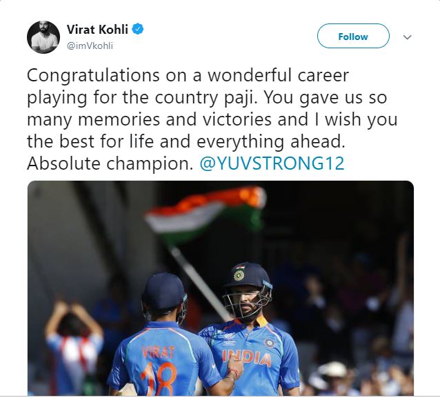 "Congratulations on a wonderful career playing for the country paji. You gave us so many memories and victories and I wish you the best for life and everything ahead. Absolute champion. @YUVSTRONG12," Indian skipper Virat Kohli tweeted.