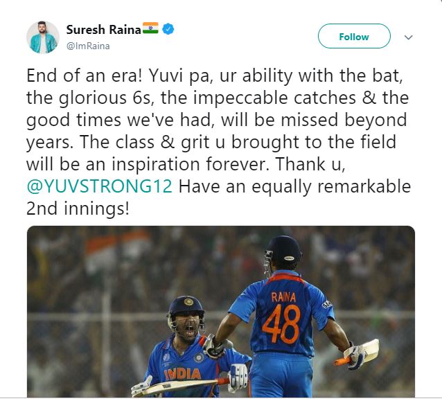 "End of an era! Yuvi pa, ur ability with the bat, the glorious 6s, the impeccable catches & the good times we've had, will be missed beyond years. The class & grit u brought to the field will be an inspiration forever. Thank u, @YUVSTRONG12 Have an equally remarkable 2nd innings," Indian cricketer Suresh Raina posted on Twitter.