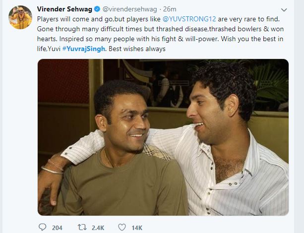 "Players will come and go, but players like @YUVSTRONG12 are very rare to find. Gone through many difficult times but thrashed disease, thrashed bowlers & won hearts. Inspired so many people with his fight & will-power. Wish you the best in life, Yuvi #YuvrajSingh. Best wishes always," Former Indian cricketer Virender Sehwag tweeted.