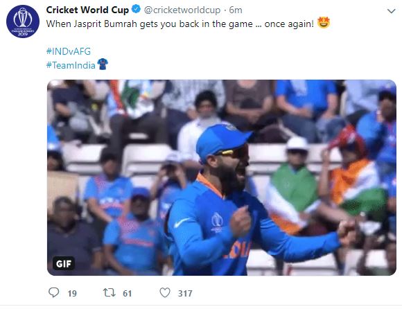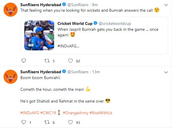 Sunrisers Hyderabad, IPL franchise, said: "Boom boom Bumrah!! Cometh the hour, cometh the man! He's got Shahidi and Rahmat in the same over." Sunrisers also replied to Cricket World Cup's tweet and said, "That feeling when you're looking for wickets and Bumrah answers the call."