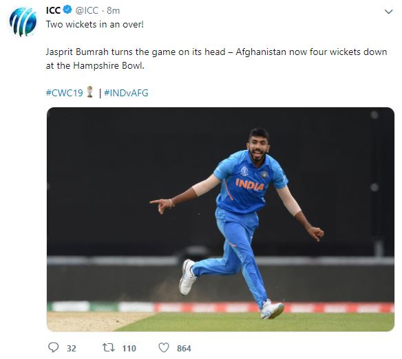 ICC in a tweet said Bumrah turned the game. "Two wickets in an over! Jasprit Bumrah turns the game on its head - Afghanistan now four wickets down at the Hampshire Bowl," ICC wrote.