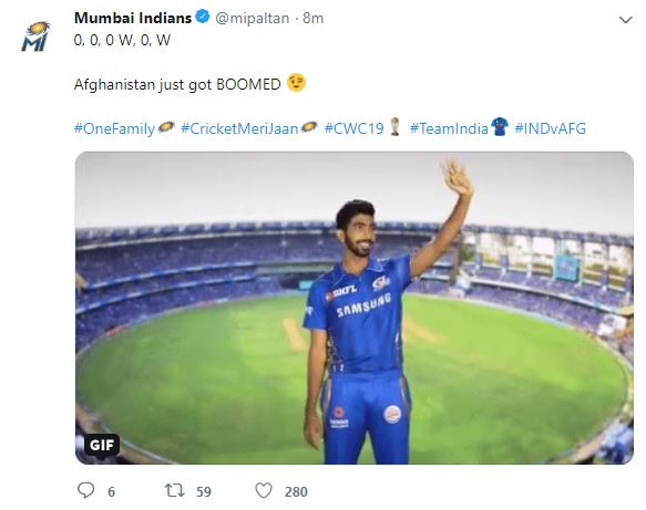 IPL franchise Mumbai Indians, for which Bumrah plays, tweeted: "0, 0, 0 W, 0, W Afghanistan just got BOOMED,"