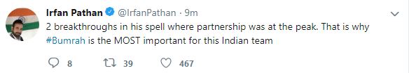 Former India all-rounder Irfan Pathan said, "2 breakthroughs in his spell where partnership was at the peak. That is why #Bumrah is the MOST important for this Indian team."