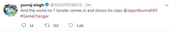 In a Tweet, former India cricketer Yuvraj Singh said, "And the world no 1 bowler comes in and shows his class @Jaspritbumrah93 #GameChanger."