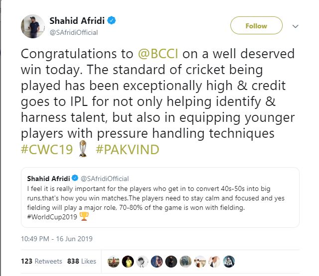 "Congratulations to @BCCI on a well-deserved win today. The standard of cricket being played has been exceptionally high & credit goes to IPL for not only helping identify & harness talent but also in equipping younger players with pressure handling techniques #CWC19 #PAKVIND," former Pakistan cricketer Shahid Afridi tweeted.