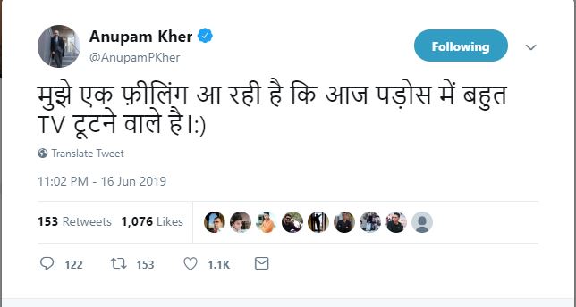 "mujhe ek ph'iiliNg aa rhii hai ki aaj pdd'os meN bhut TV ttuuttne vaale hai / :)," Bollywood actor Anupam Kher tweeted.